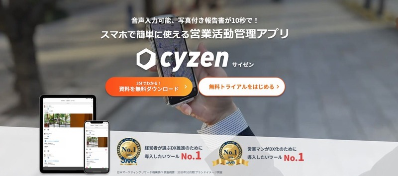 cyzenは、スマホ利用も可能な営業支援ツールです。音声入力機能や写真付きの報告書機能もあり、最短10秒で作成できることが特徴です。