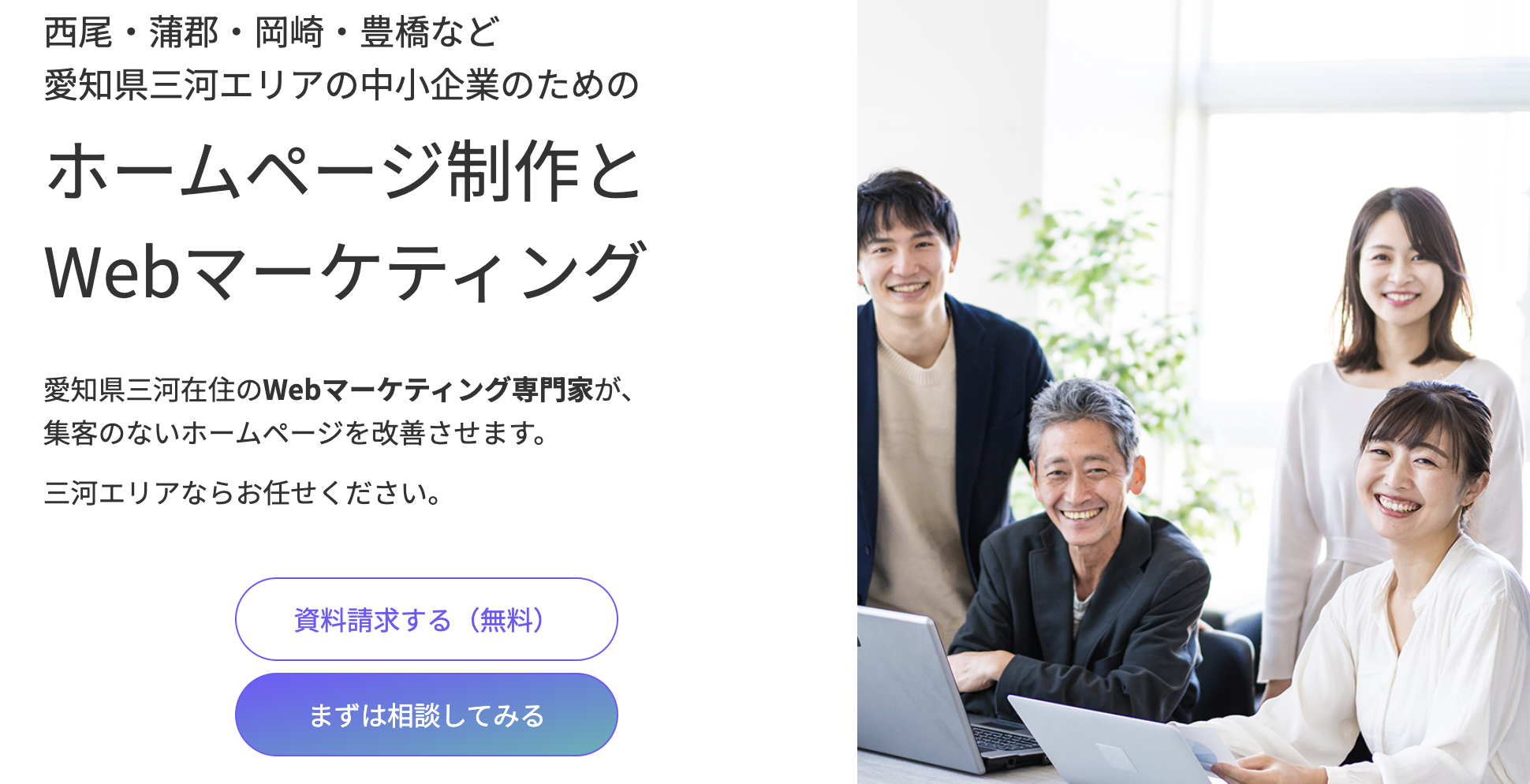 | 従業員数 | (事業パートナー)西尾市のエキスパート相談員、SEOディレクター兼ライター、 カメラマン、動画クリエーター、デザイナー、コーダーなど多数 |