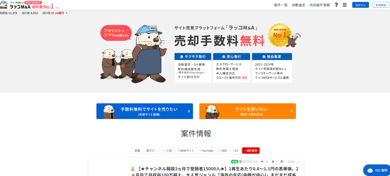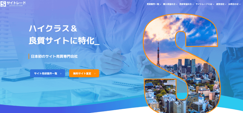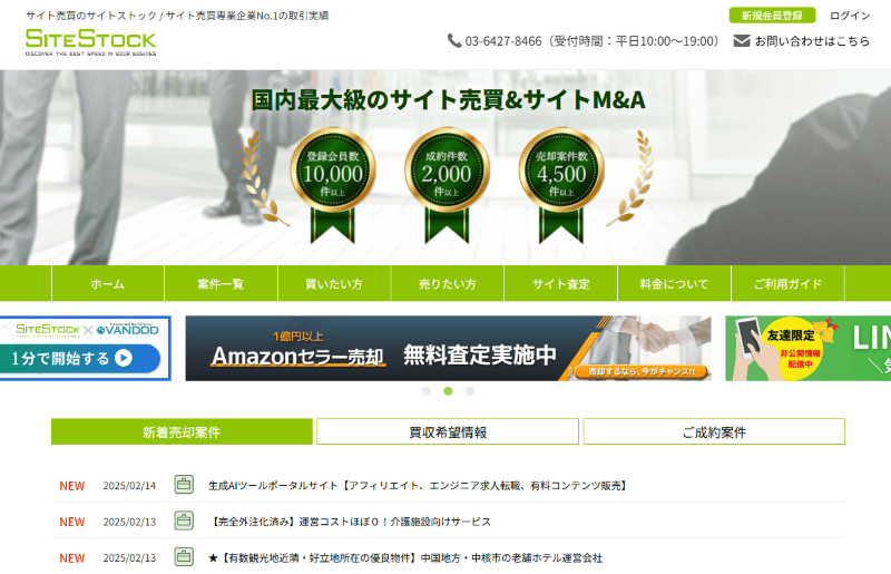 サイトストックは、1万社以上の会員を誇る国内最大級のサイト売買・M&A仲介プラットフォームです。数千社の企業ネットワークや非公開案件も多数保有し、VC・証券会社への紹介も可能。仲介交渉と直接交渉の2つのプランを提供し、専門家による査定サービスも完備しています。