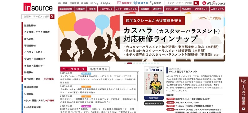 「インソース株式会社」は、講師が企業に出向いて研修を受けられる「講師派遣型研修」と全国6都市52のセミナールームで受講できる「公開講座」、場所を選ばずに参加できる動画・eラーニングの3つの受講方法から選択できます。
