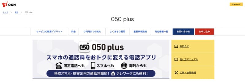 | 通話料金 | 050 plus・OCN ドットフォン:無料 国内の一般加入電話(全国一律):発信は8.8円/3分、受信は11.88円/3分 国内のケータイ(全事業者一律):発信は17.6円/分、受信はご利用電話会社の通話料 有料通話先プロバイダ:発信は8.8円/3分、受信はご利用電話会社の通話料 国際電話:アメリカへの発信は9円/分、中華人民共和国への発信は29円/分、受信はご利用電話会社の通話料 |