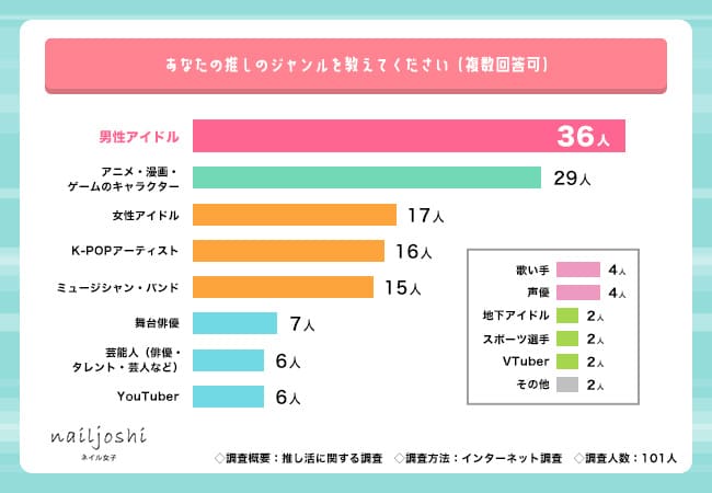 - 推し活ジャンルでは「男性アイドル」(36人)が最多、次いで「アニメ・漫画・ゲームのキャラクター」(29人)、「女性アイドル」(17人)の順
