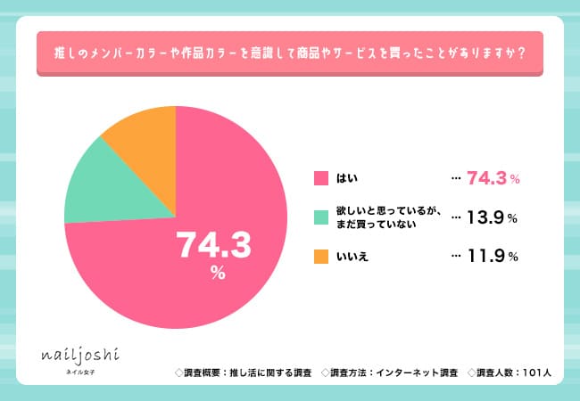 - 推しのメンバーカラーや作品カラーを意識して商品を購入した経験がある人は74.3%と圧倒的多数