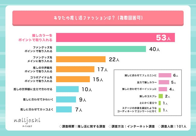 - 推し活ファッションは「推しカラーをポイントで取り入れる」(53人)が最も人気