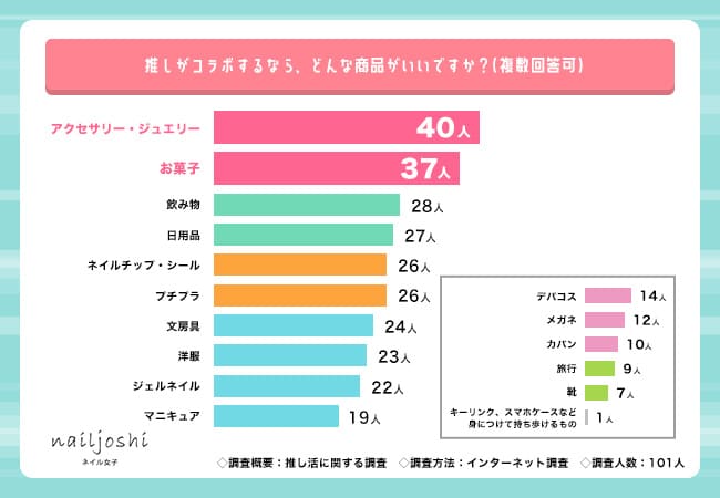 - 推しとのコラボで期待する商品は「アクセサリー・ジュエリー」(40人)が最多