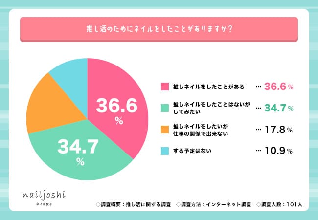 次に「推し活のためにネイルをしたことがありますか?」と質問したところ、「推しネイルをしたことがある」と答えた人が36.6%と最も多く、3割以上の方は、実際に推し活の一環としてネイルを楽しんでいるようです。