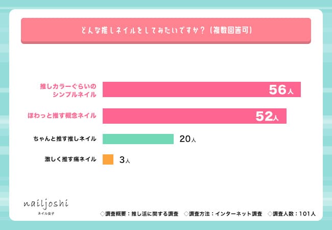 最後に「どんな推しネイルをしてみたいですか?(複数回答可)」と質問したところ、「推しカラーぐらいのシンプルネイル」(56人)が最も多くの支持を集めました。次いで「ほわっと推す概念ネイル」(52人)が僅差で続き、3位には「ちゃんと推す推しネイル」(20人)がランクインしています。