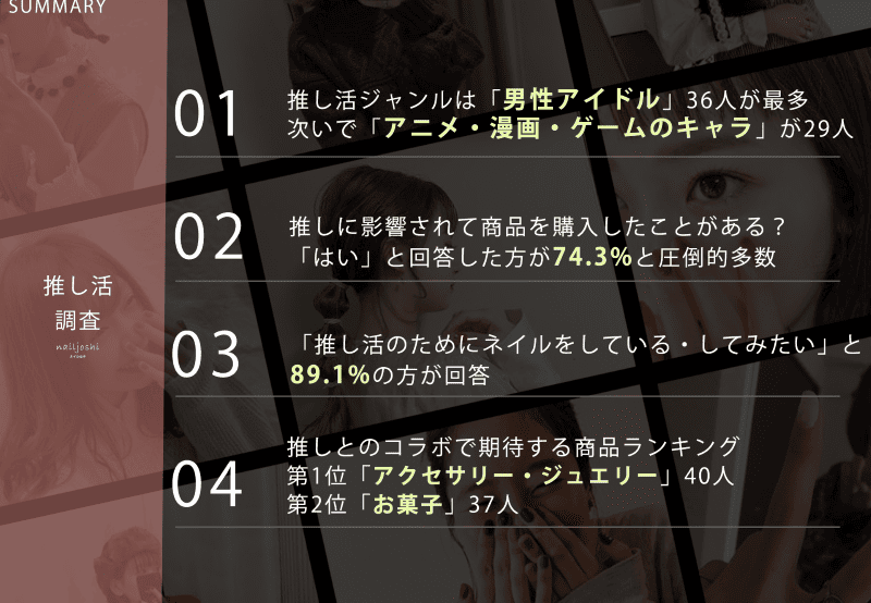 「推しカラーぐらいのシンプルネイル」と「ほわっと推す概念ネイル」が上位を占めた結果は、ファンが日常生活との調和を重視しつつ、控えめながらも自分だけの特別な形で推しへの愛を表現したいという願望を反映していると考えられます。