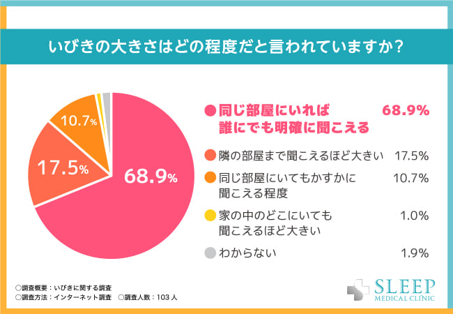 次に「いびきの大きさはどの程度だと言われていますか?」と質問したところ、いびきの音が「同じ部屋にいれば誰にでも明確に聞こえる」と答えた方は68.9%に達しました。