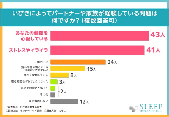 • いびきによってパートナーや家族が感じている問題の第1位は「あなた(いびきをかいている人)の健康を心配している」(43人)