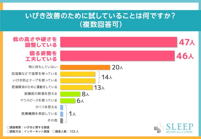 次に「いびき改善のために試していることは何ですか?(複数回答可)」と質問したところ、いびき改善のために最も多くの人が試している方法は「枕の高さや硬さを調整している」で、47人が回答しました。