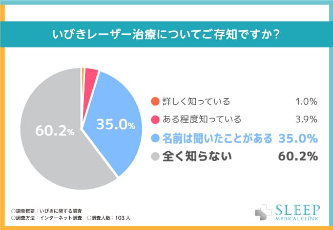 最後に「いびきレーザー治療についてご存知ですか?」と質問したところ、「全く知らない」が60.2%で最多回答数、「名前は聞いたことがある」が35.0%で、続いて「ある程度知っている」が3.9%となりました。